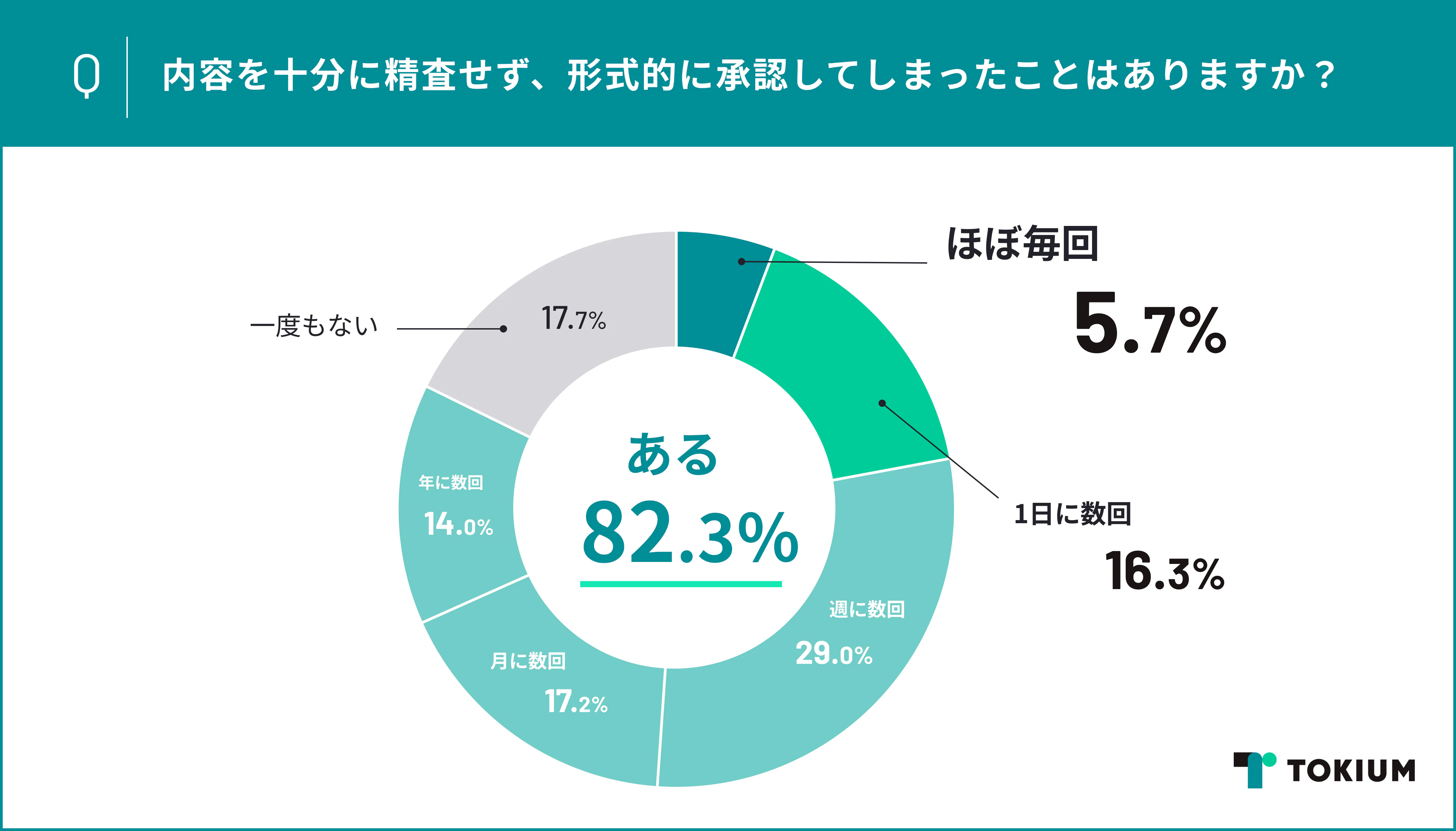 今回の調査で、役職者全体の82.3%が、申請内容を十分に精査せず形式的に承認してしまったことが「ある」と回答しました。なかでも「ほぼ毎回」形式的に承認している回答者は5.7%にのぼります。また「ほぼ毎回(5.7%)」「1日に何度かある(16.3%)」「週に何度かある(29.0%)」を合わせると51.0%に達しています。本来、企業のガバナンスを支えるべき承認業務が、現場では形骸化している実態が浮き彫りとなりました。