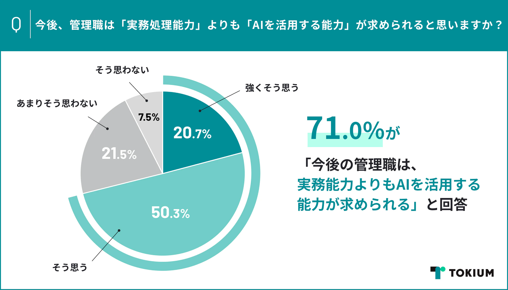 こうした限界を背景に、管理職に求められる資質への意識が変化しています。「今後の管理職は、実務能力よりもAIを活用する能力が求められる」と回答した人は71.0%に達しました。