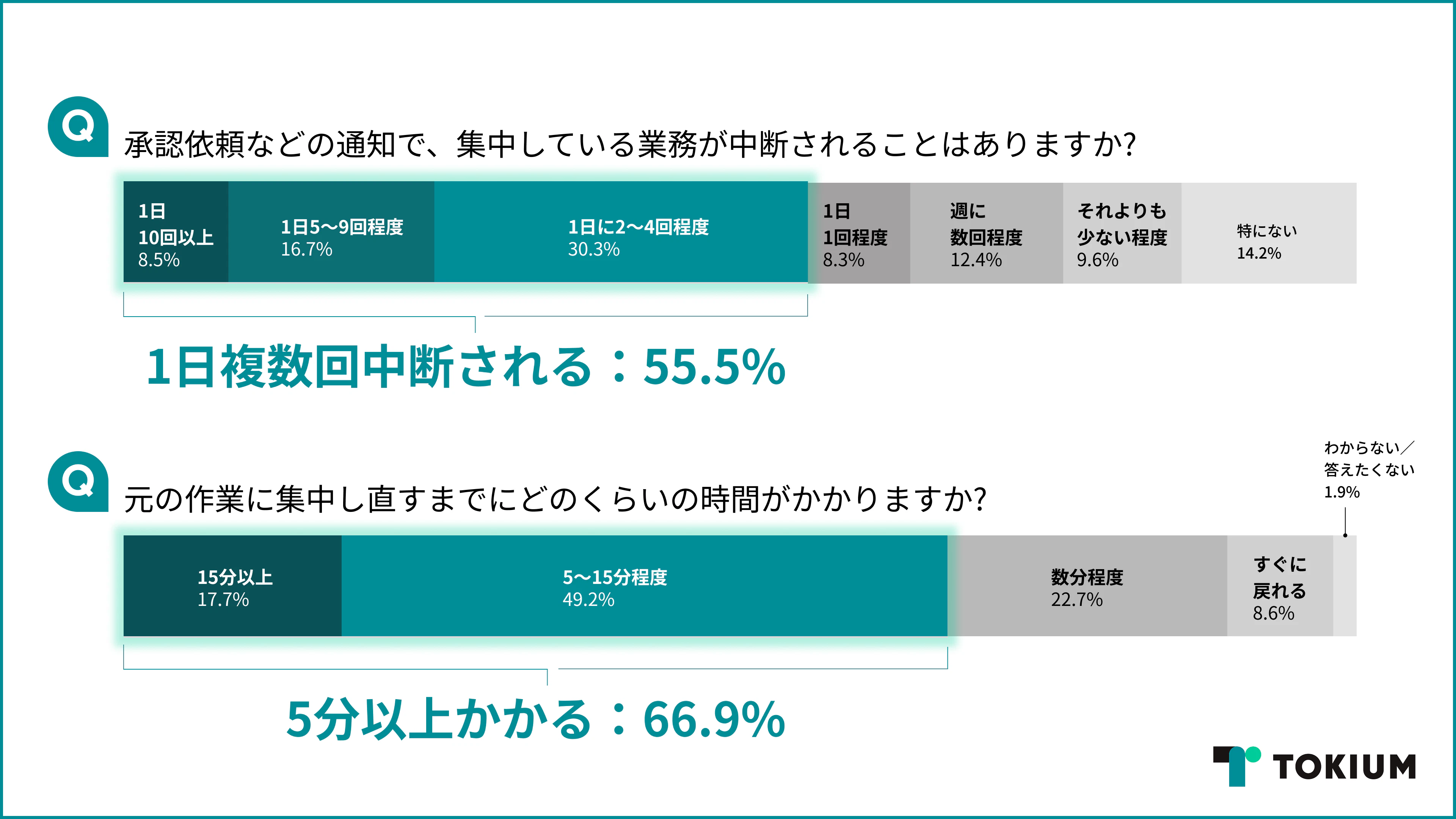 課題として浮かび上がるのは、一度中断された作業に再び集中し直すまでの時間です。復帰に『5分以上かかる』と回答した層が66.9%に上っており、業務の切り替えに伴う心理的・時間的コストが生じている実態がうかがえます。