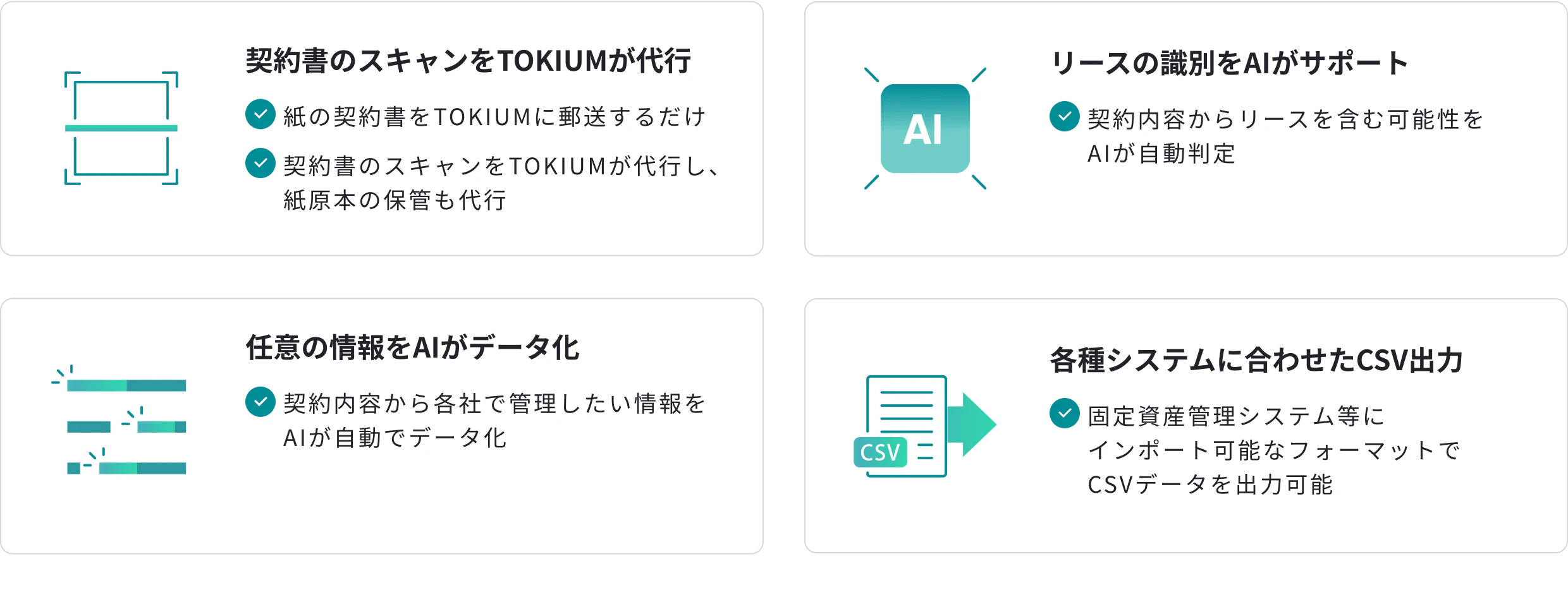 「TOKIUM契約管理」は、締結済みの契約書を一元管理するクラウド契約管理システムです。すべての契約書を電子化してAI-OCRによる全文文字起こしのほか、2027年4月以後に開始する会計年度より強制適用となる「新リース会計基準」においてリースに該当するかどうかをAIが自動判定する機能を有しています。
