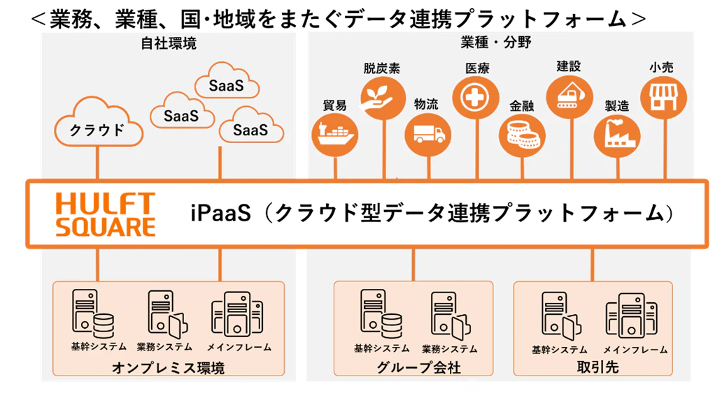 「HULFT Square」は、DX実現に必要な「データ活用するためのデータ準備」や「業務システムをつなぐデータ連携」を支援する日本発iPaaS(クラウド型データ連携プラットフォーム)です。オンプレミス・クラウド・SaaSなどの環境に分散し管理されているさまざまなデータを、業務システム間、業種、国・地域をまたぎデータを連携させることができます。