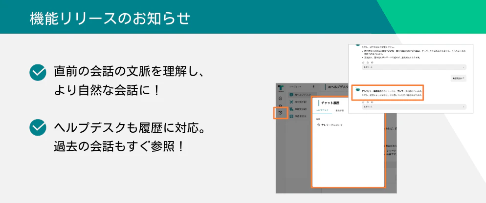 このたび、TOKIUM AIヘルプデスクに「文脈理解」「履歴保存」「プレビュー機能」の計3種の新機能を追加いたしました。
