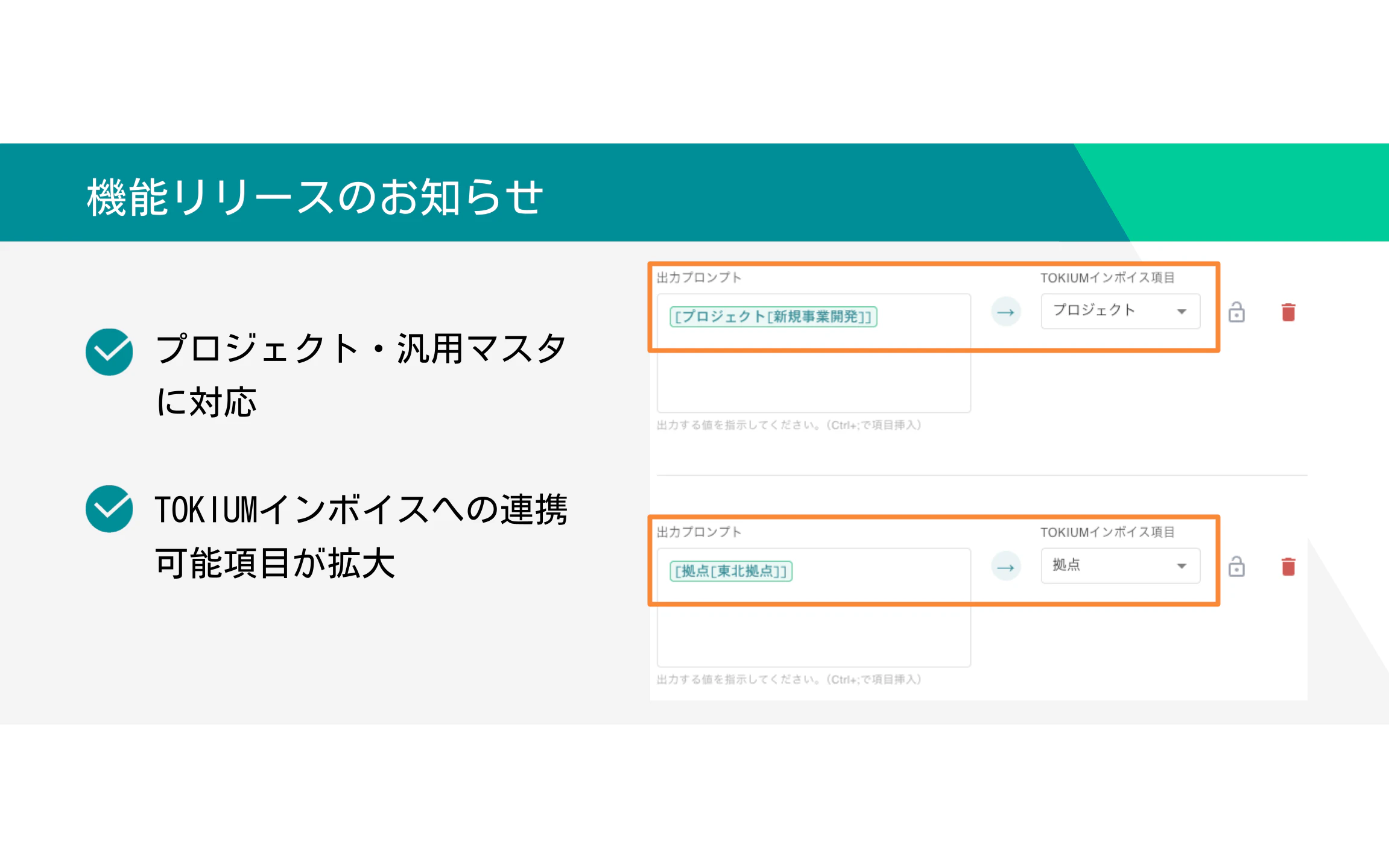 このたび、AI明細入力からTOKIUMインボイスに連携できる項目として、新たに「プロジェクト」と「汎用マスタ」に対応します。