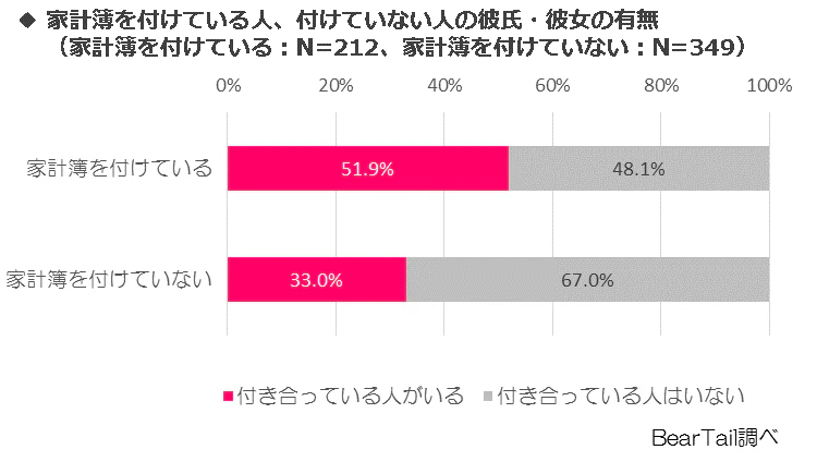 20代~60代の未婚の男女(N=561)を対象に、家計簿を付けているかを聞いたところ、家計簿を付けている人は37.8%だった。家計簿を付けている人(N=212)、家計簿を付けていない人(N=349)を対象に、現在、彼氏・彼女がいるかを聞いたところ、彼氏・彼女がいると回答した人の51.9%が家計簿を付けていて、家計簿を付けていない人が33%と、家計簿を付けている人の方が18.9ポイント高かった。
