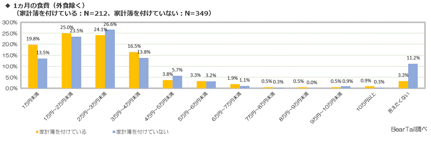 続いて、家計簿を付けている人(N=212)、家計簿を付けていない人(N=349)を対象に、以下の項目について1ヵ月に掛かる費用についてそれぞれどのくらい費用を掛けているかを調査しました。