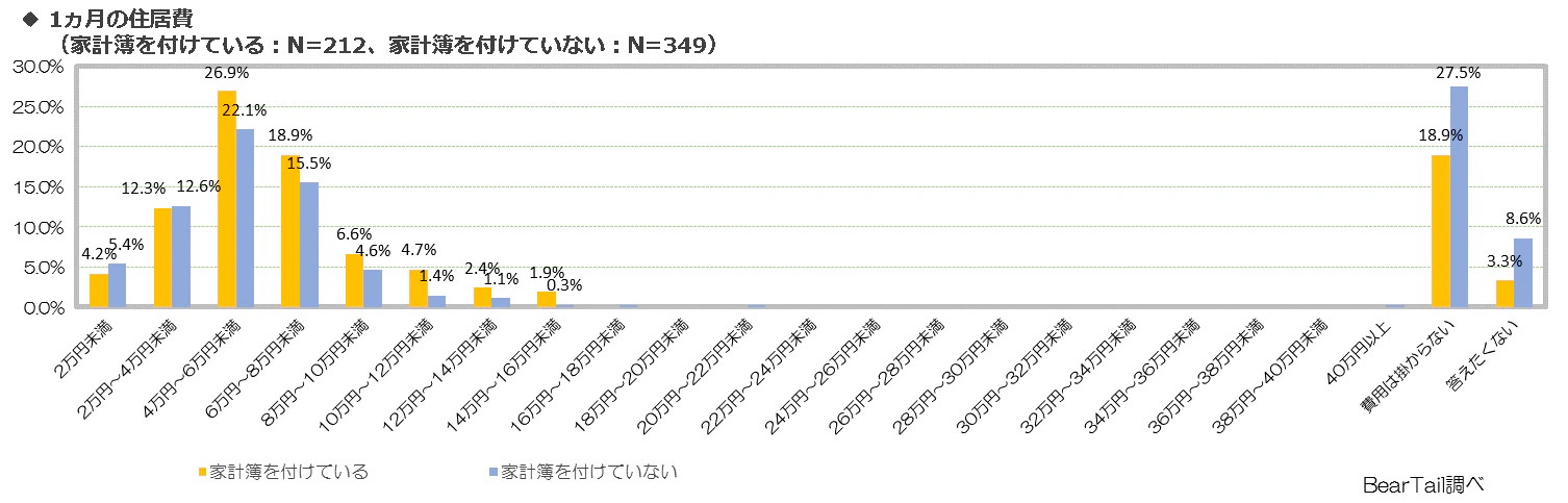 まず、住居費について、家計簿を付けている人の平均は61,400円に対して、付けていない人は56,500円と、家計簿を付けている人の方が約5,000円高かった。また、「費用は掛からない」と回答した人は家計簿を付けている人で18.9%、付けていない人で27.5%と、付けていない人の方が8.6ポイント高い結果となった。