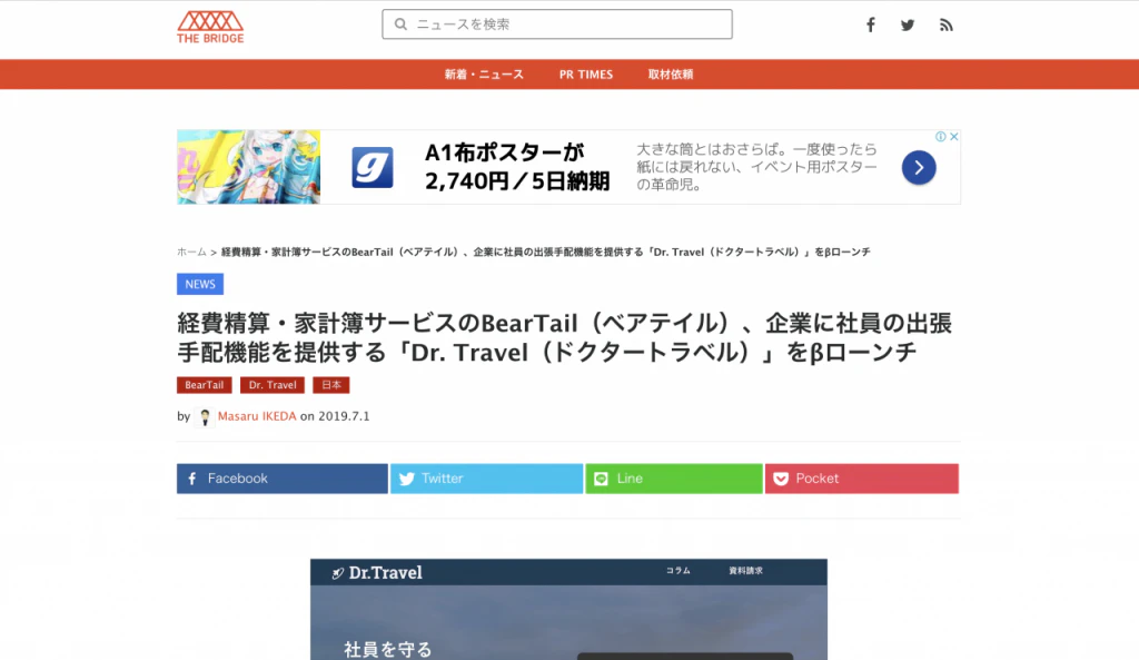 株式会社BearTail(本社:東京都千代田区、代表取締役社長:黒崎賢一)が開発・運営する「Dr.Travel」のβ版リリースに関して、THE BRIDGEにてご紹介いただきました。