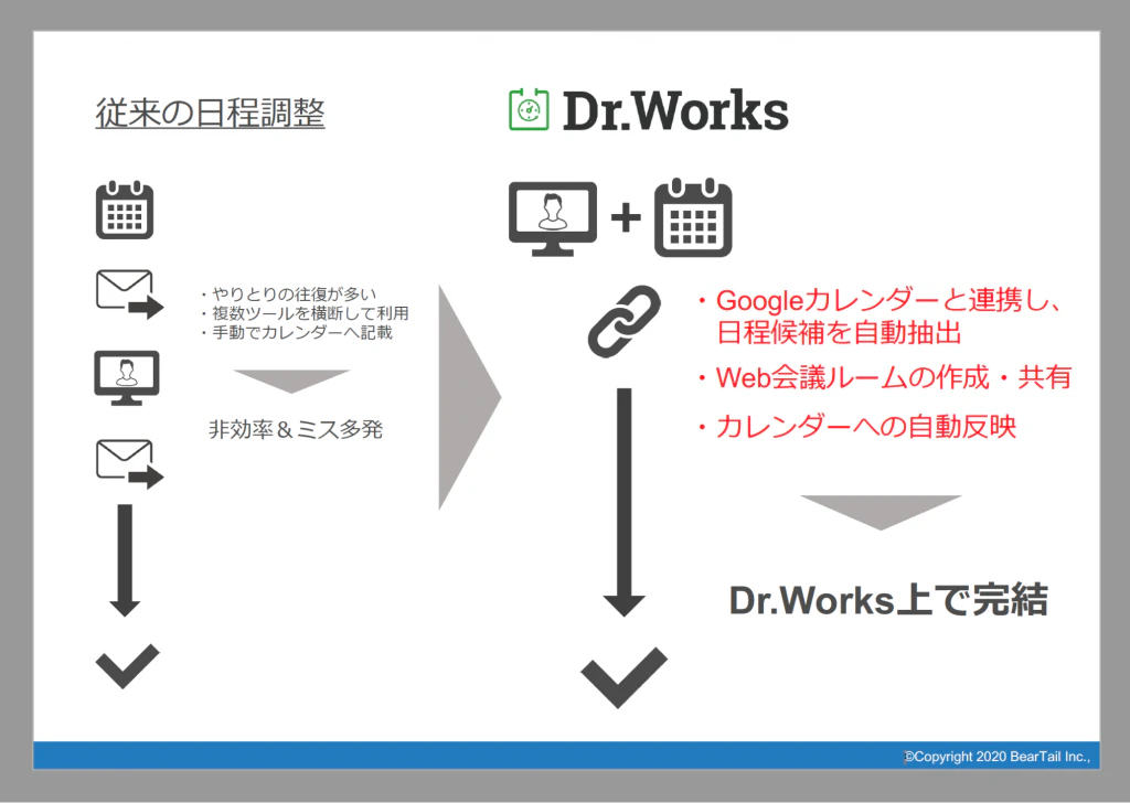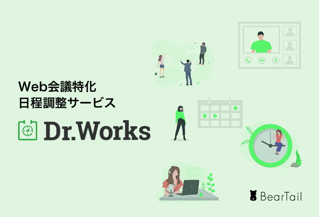 株式会社BearTail(本社:東京都千代田区、代表取締役社長:黒﨑賢一、以下「BearTail」)は、日本初のWeb会議に特化した日程調整ツール「Dr.Works」の事前登録を5月14日に開始しました。