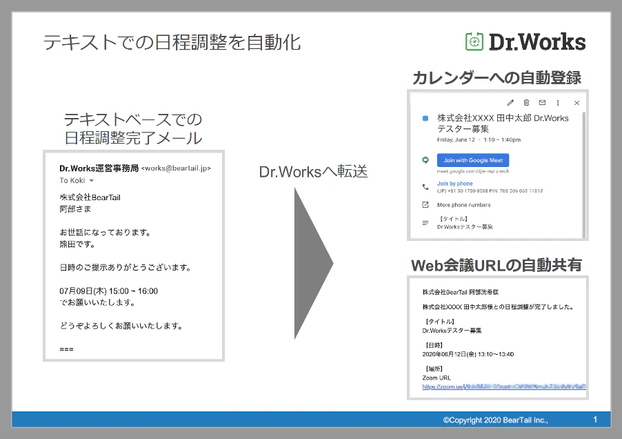 株式会社BearTail(本社:東京都千代田区、代表取締役社長:黒﨑賢一、以下「BearTail」)が運営する日本初のWeb会議に特化した日程調整ツール「Dr.Works」が、テキストでの日程調整をメール転送で自動化するサービスを2020年7月7日に開始しました。