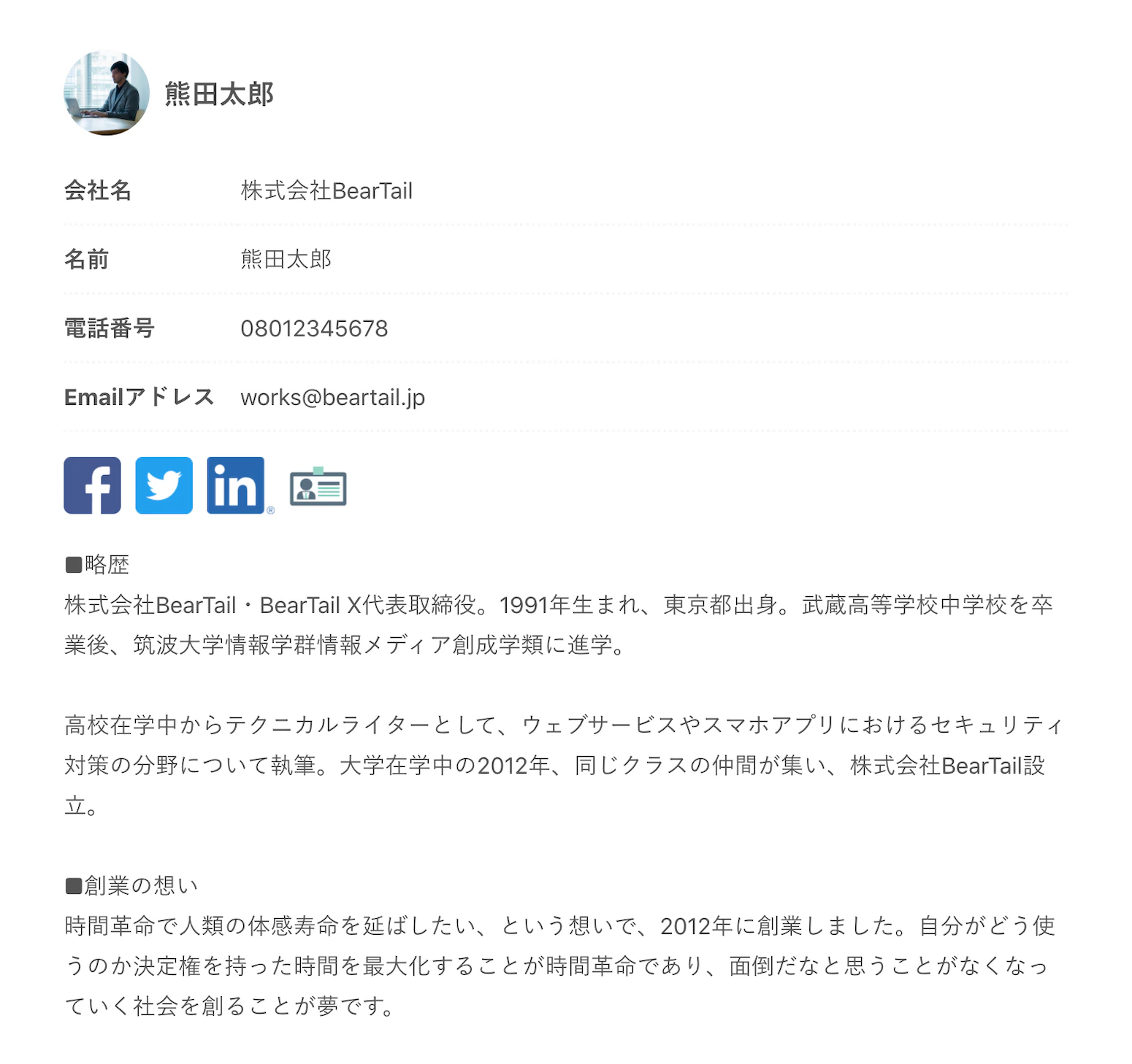 設定が完了すると、オンライン名刺を共有することのできるプロフィールページが作成されます。