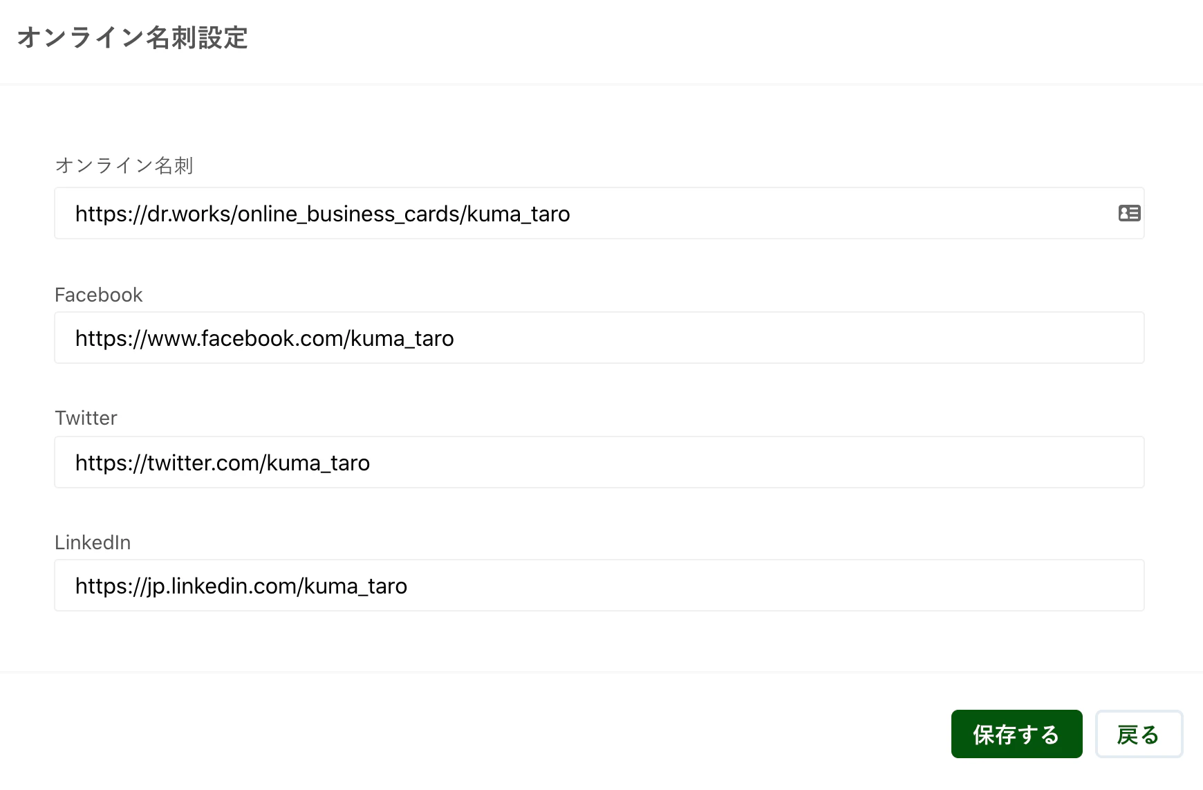 設定画面からオンライン名刺の設定をします。オンライン名刺のURL以外に、下記SNSのプロフィールURLも対応しています。
