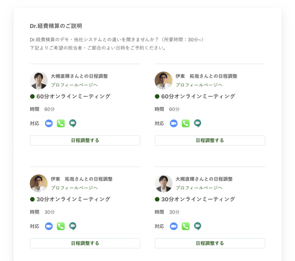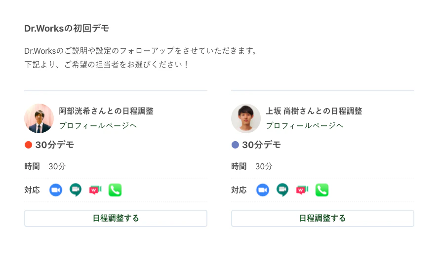 潜在顧客はプロフィールページを見て、話を聞きたい担当者を選択することが可能となります。「Zoom」や「Meet」といった使用するWeb会議ツールは担当者ごとに設定することもできます。