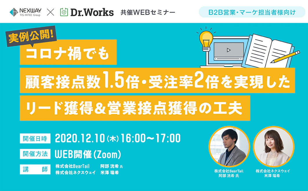 株式会社ネクスウェイ(本社:東京都港区、代表取締役社長:松森正彦、以下ネクスウェイ)と株式会社BearTail(本社:東京都千代田区、代表取締役社長:黒﨑賢一、以下「BearTail」)の運営する日程調整・営業支援ツール「Dr.Works」が、2020年12月10日(木)16:00-17:00に「~B2B営業・マーケ担当者様向け~実例公開!コロナ禍でも顧客接点数1.5倍・受注率2倍を実現したリード獲得&営業接点獲得の工夫」と題した参加無料のウェビナーを開催することをお知らせいたします。