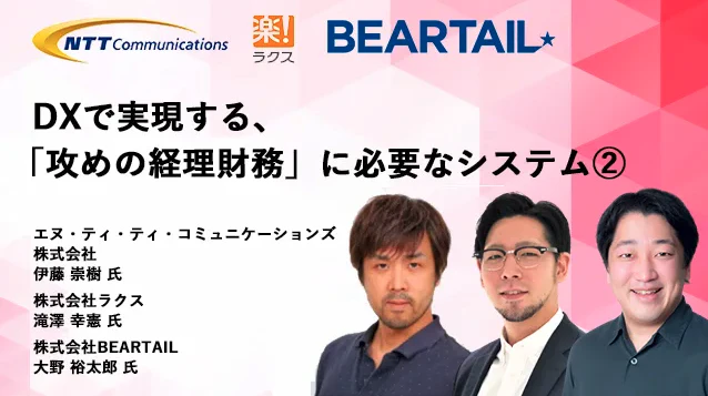 当日は、エヌ・ティ・ティ・コミュニケーションズ株式会社、株式会社ラクスと3社合同で登壇し、『DXで実現する、「攻めの経理財務」に必要なシステム」のタイトルでセッションを行います。