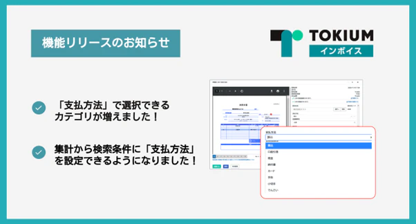 株式会社TOKIUM(本社:東京都千代⽥区、代表取締役:黒﨑賢一、以下「当社」)は、請求書受領クラウド【TOKIUMインボイス】の新機能として選択できる支払方法のカテゴリを追加しましたのでお知らせいたします。