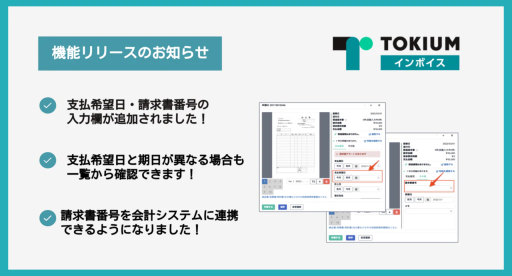 株式会社TOKIUM(本社:東京都千代⽥区、代表取締役:黒﨑賢一、以下「当社」)は、同社が提供する請求書受領クラウド【TOKIUMインボイス】の新機能として、「請求書番号」と「支払い希望日」の入力欄を追加しましたので、お知らせいたします。