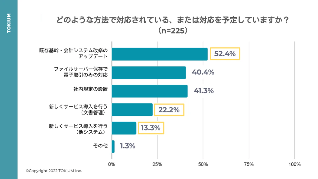 一方で、「対応している」、もしくは「対応予定」と答えた企業のうち、新たなシステムの入れ替えなどを実施するのではなく「既存の基幹・会計システムの改修やアップデート」にとどまっているケースは52.4%と半数を超え、文書管理などの新しいシステムの導入を「実施する」と答えたのは22.2%、その他のシステムなどの新しい導入を「実施すると」と回答したのは13.3%といずれも低い数字となりました。