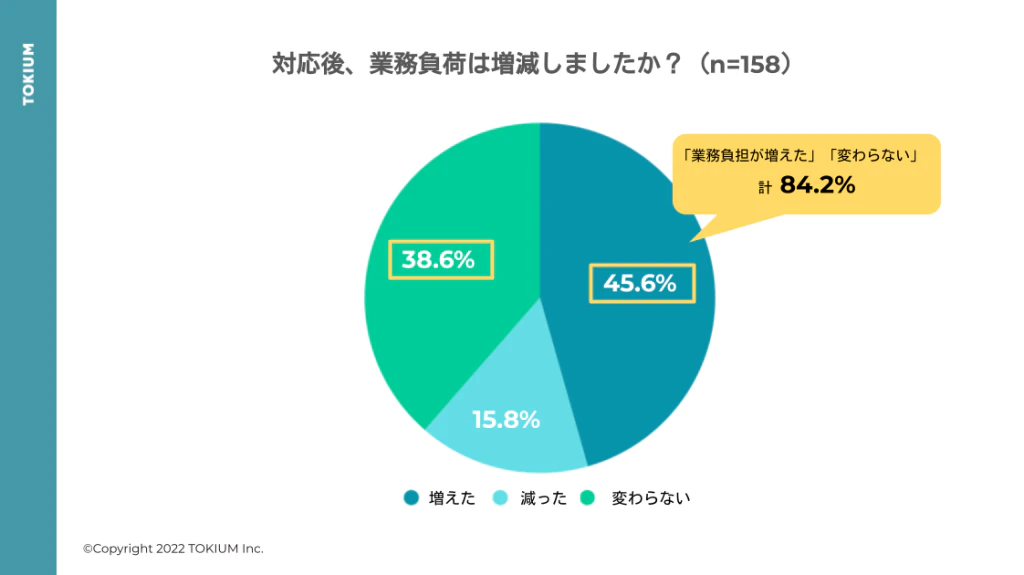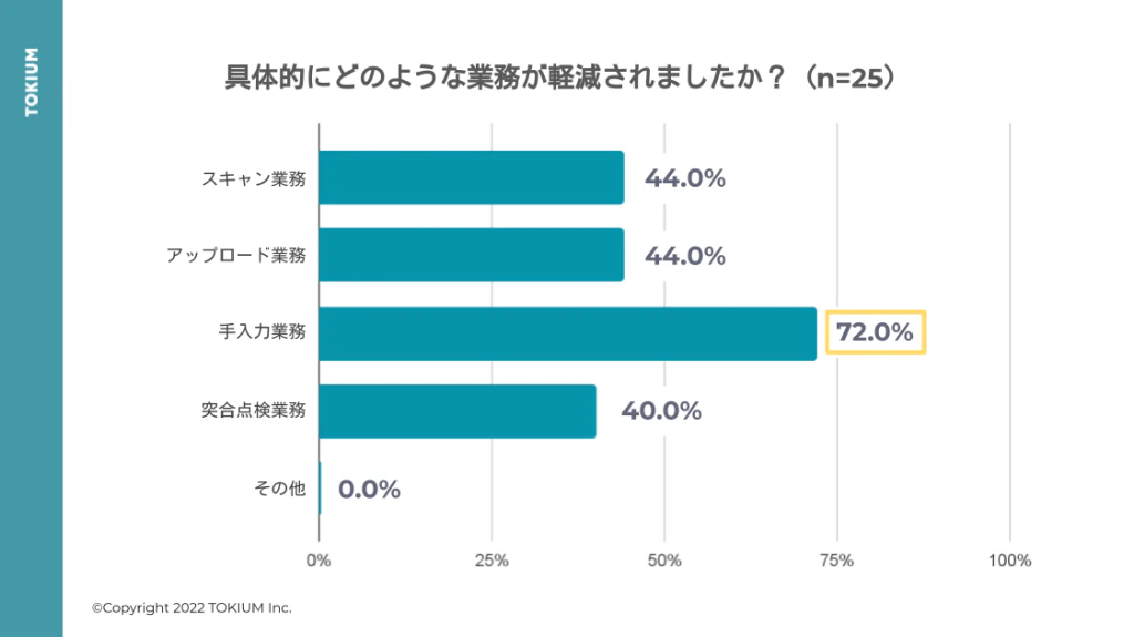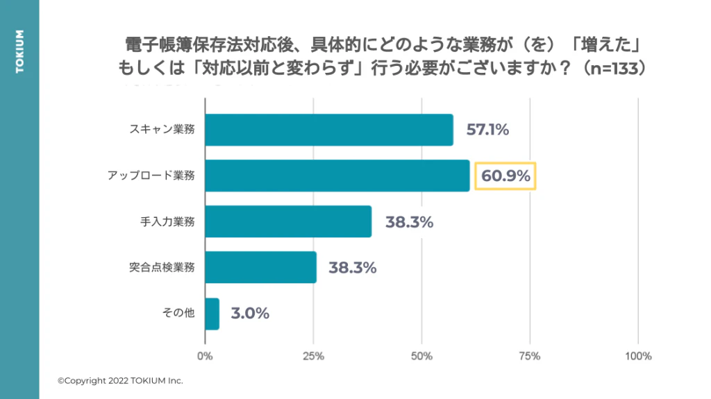 さらに対応後に「業務負荷が減った」と回答したのはわずかに15.8%にとどまり、対照的に「業務が増えた」と回答したのは45.6%、「変わらない」が38.6%と、改正電帳法に対応するために現場の手作業が増えている実態が浮かび上がってきました。増加した業務負担についての具体的な内容は、アップロード業務が60.9%、スキャン業務が57.1%、手入力業務が38.3%、突合点検業務が25.6%でした。