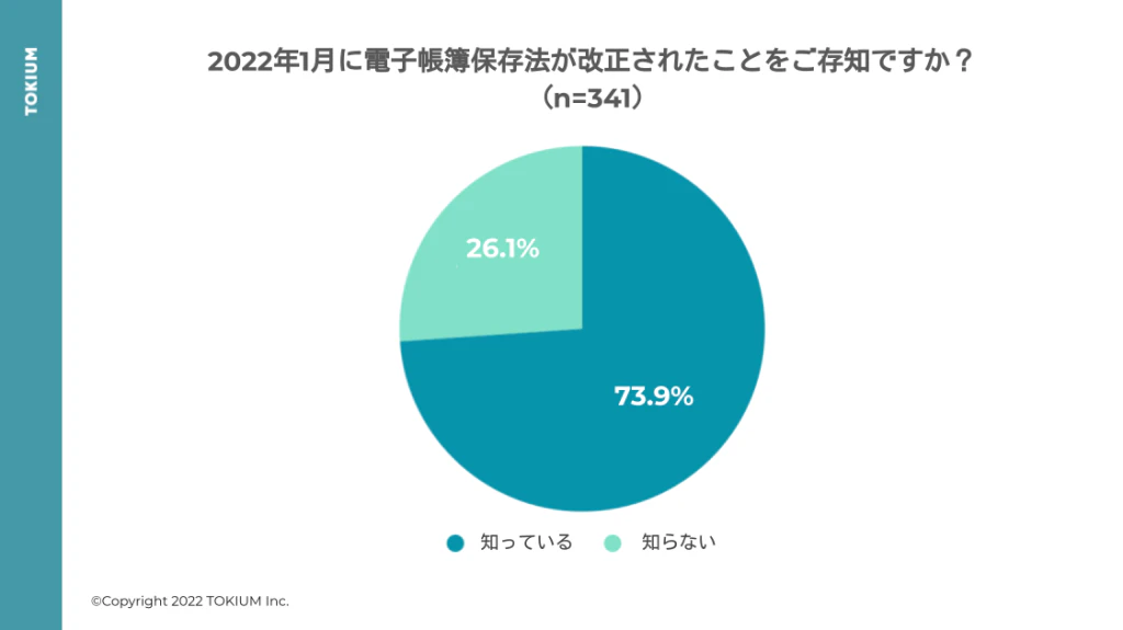 未来へつながる時を生む支出管理クラウド【TOKIUM】を提供する株式会社TOKIUM(本社:東京都千代田区、代表取締役:黒﨑 賢一、以下「TOKIUM」)は、令和4年1月1日に改正された電子帳簿保存法(以下、改正電帳法)に関する調査を全国の正社員351名を対象に行いました。電帳法は、経理の電子化による生産性の向上、記帳水準の向上等を目的として改正されましたが、その後の各企業の対応状況や業務効率化の状況について、アンケート調査を実施しました。