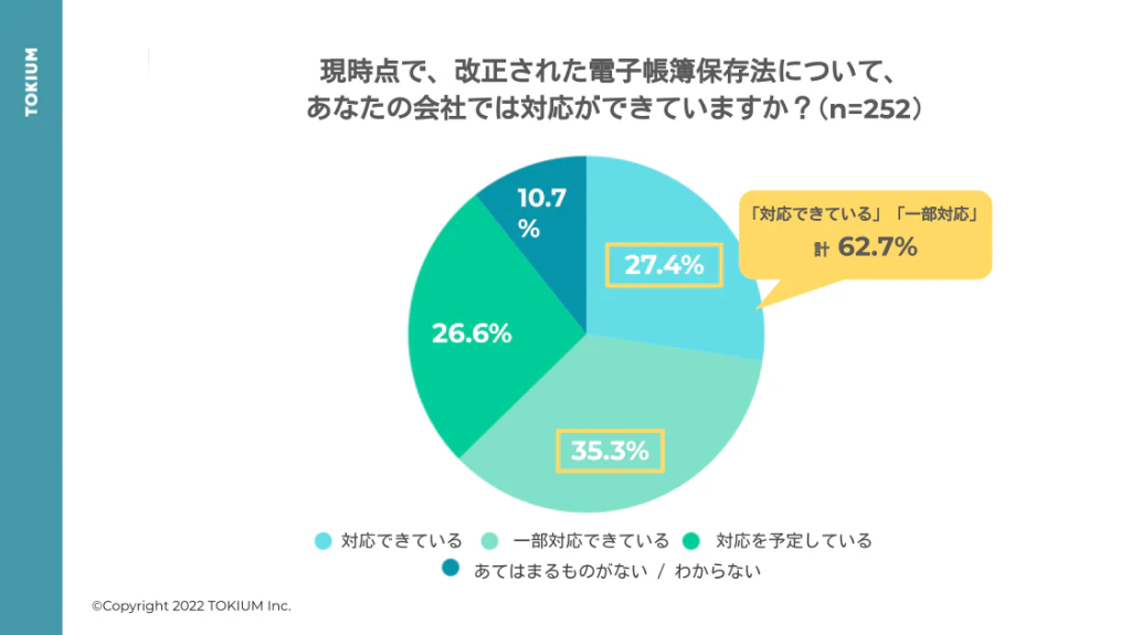 電子帳簿保存法が改正されたことついて「知っている」と答えた割合は73.9%。認知度が高いことがわかりました。今回の改正で各企業の対応については、「対応ができている」(「一部対応」を含む)と回答したのは6割を超える62.7%で、多くの企業が対応を実施していました。