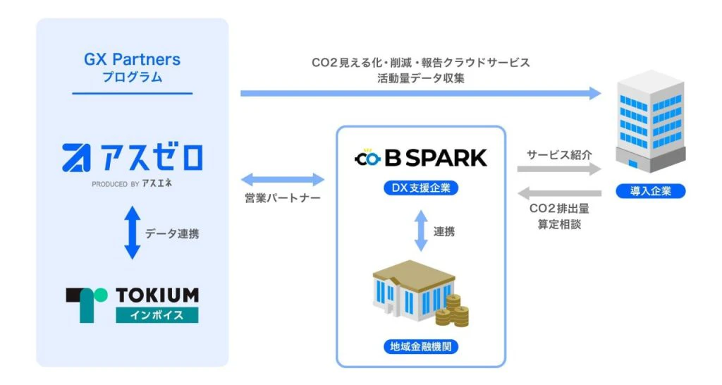 支出管理クラウド「TOKIUM」を提供する株式会社TOKIUM(代表取締役:黒﨑 賢一、本社:東京都千代田区、以下「TOKIUM」)は、請求書受領からCO2排出量算定までを一気通貫で行うプログラム「GX Partners」の営業パートナーとして株式会社B Spark(代表取締役社長:財徳 悦生、本店:東京都千代田区、以下「B Spark」)と提携することをお知らせします。今回B Sparkが取り扱いを開始するのはTOKIUMインボイスとアスエネ株式会社(本社:東京都港区、代表取締役CEO:西和田 浩平、以下「アスエネ」)が提供するアスゼロをワンストップで提供するものであり、3社で協業することにより企業のDX推進と脱炭素経営を支援します。