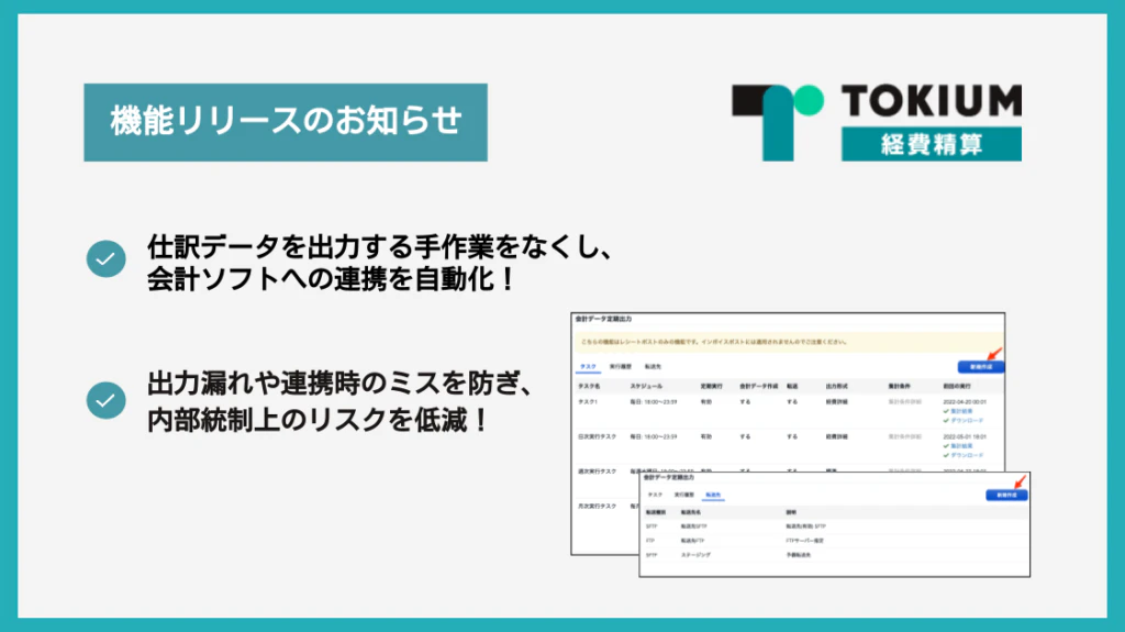 TOKIUM経費精算では、これまで仕訳データを手動で出力する必要がありました。今回のリリースで、お客様ごとの事前設定に基づいて経費の仕訳データを定期的に出力し任意のサーバーに転送することが可能となりました。これによって、自動で仕訳データが会計ソフトへ連携されます。