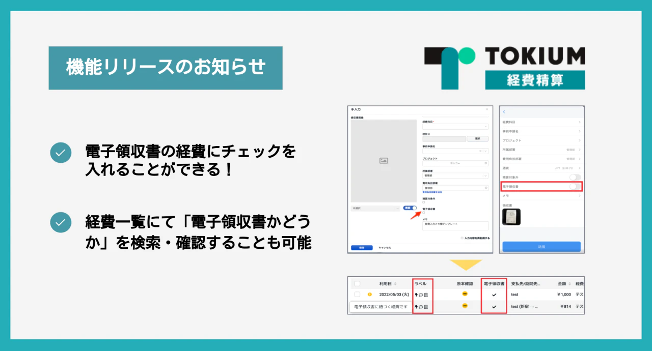 経費を作成する際に電子領収書にチェックを入れることができるようになりました。経費一覧から「電子領収書かどうか」を検索・確認することも可能です。