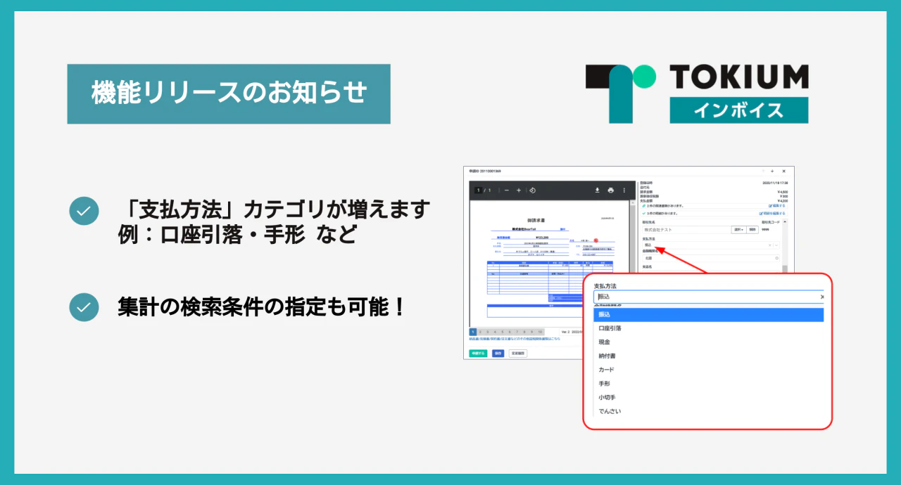 支払方法が拡充され、「振込」「口座引落」「現金」「納付書」「カード」「手形」「小切手」「でんさい」「海外送金」「その他」の指定ができるようになりました。それによって、支払方法種別ごとに集計を作成し、会計データや全銀データの出力が可能となります。