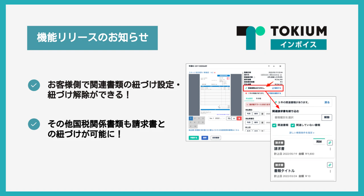 当アップデートにより、TOKIUMインボイス内で関連性のある書類同士を紐づけて管理しやすくなりました。