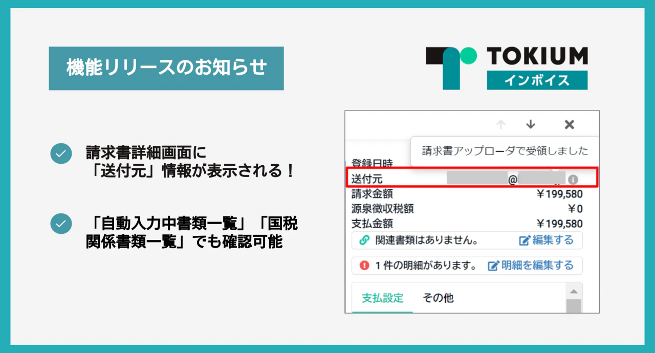 請求書詳細画面に、書類の送付元情報(メールアドレス)と送付方法が表示されるようになります。