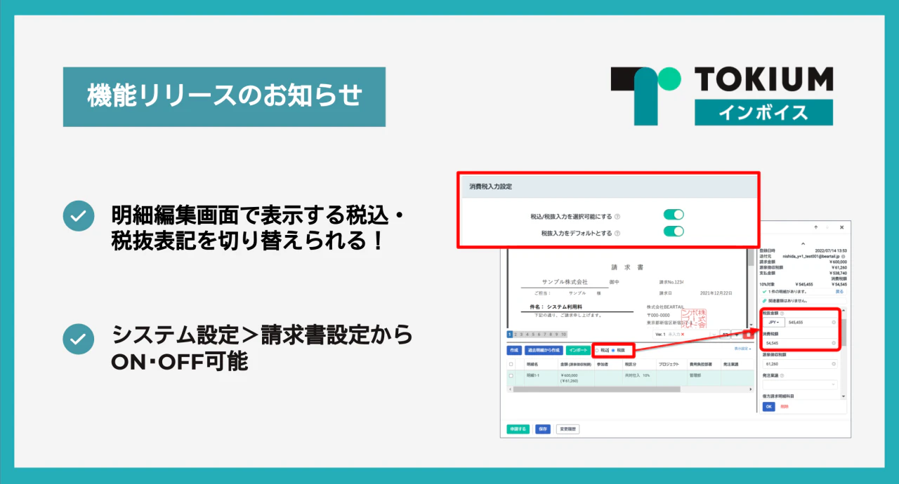 今回のアップデート以前、または消費税入力設定が有効化される以前に受領した請求書に関しては、金額表示の切り替えはできません。本機能が有効化された状態で受領した請求書のみ、切り替えが可能となりますのでご注意ください。