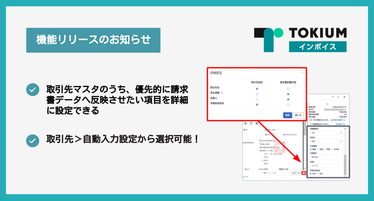 本アップデートにより、取引先名と手数料負担先のみ取引先マスタを反映させるなど、お客様の個別の要望に合わせた表示項目の設定ができるようになります。