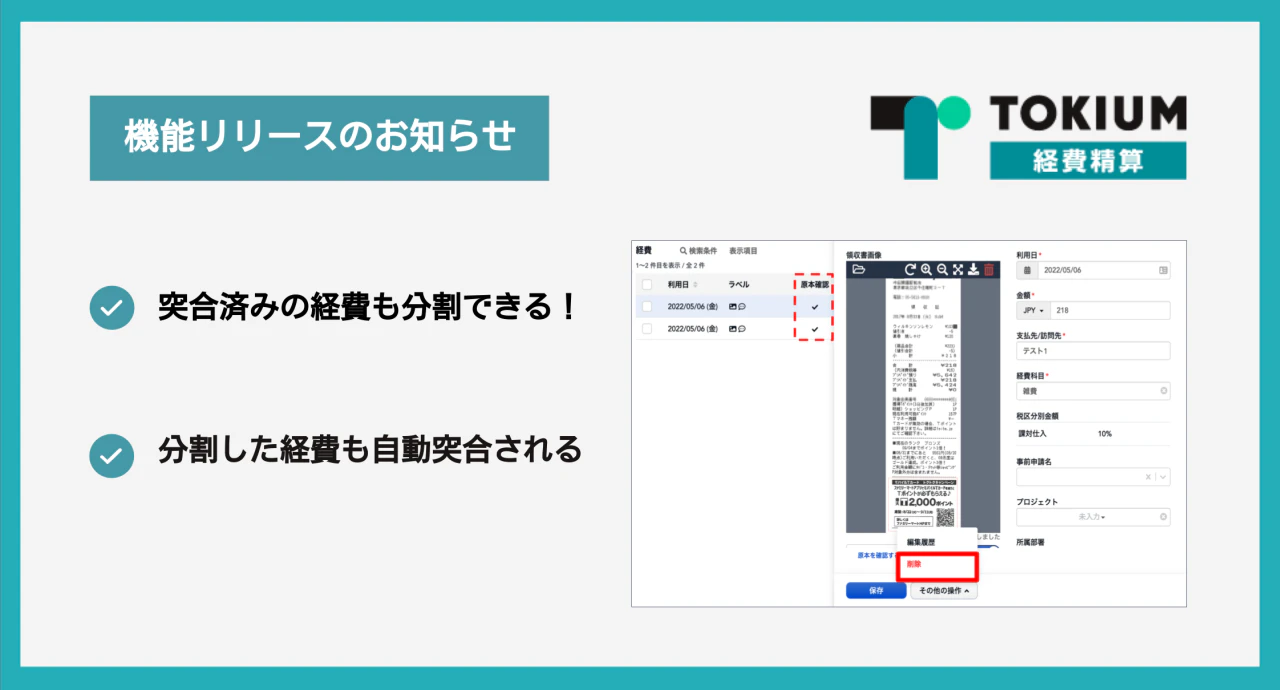 突合済みの経費も分割できるようになり、分割後も突合済みのステータスが維持されます。