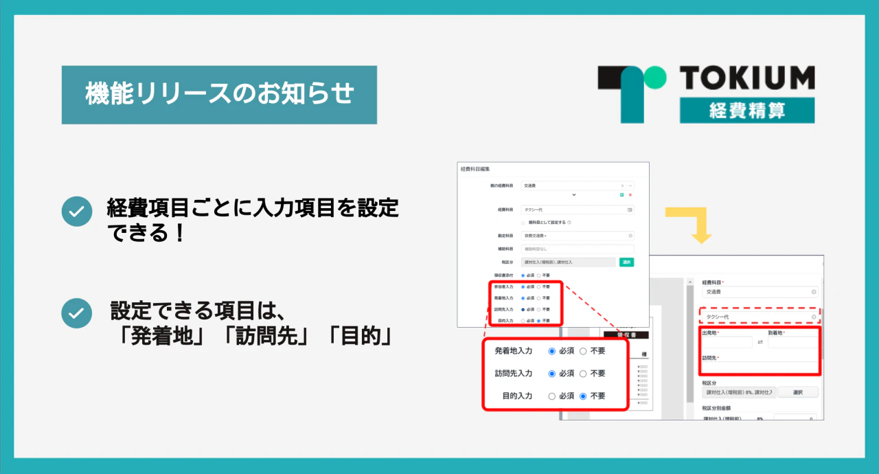 経費作成時の入力フォームに、「発着地」「訪問先」「目的」の3項目が追加されました。
