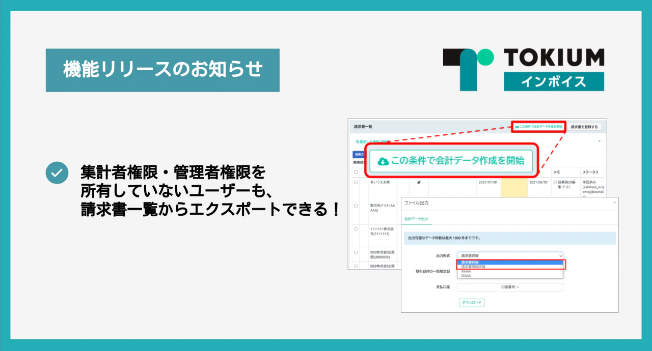 ※集計者権限をお持ちでない方は、自身が担当者として設定されている請求書データのみエクスポートすることが可能です。