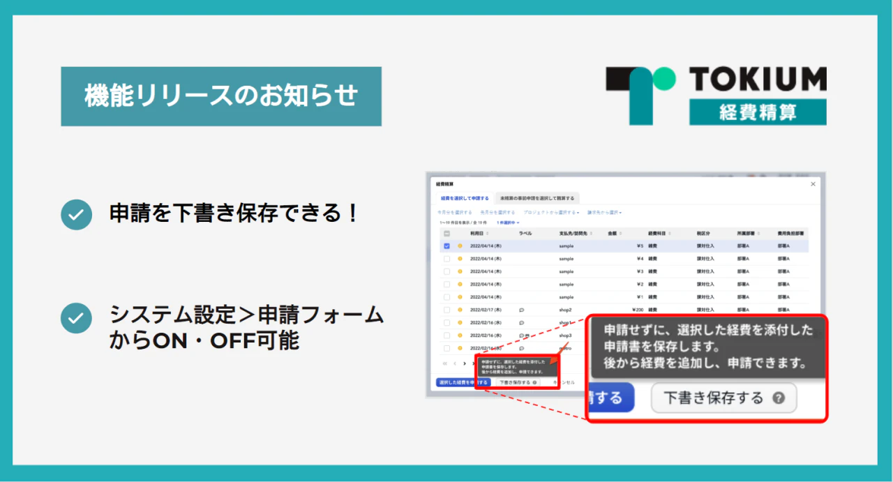 下書き保存が可能となったことで、先に申請だけを作成して、後からその申請に紐づく経費を追加して申請するといった操作が可能です。