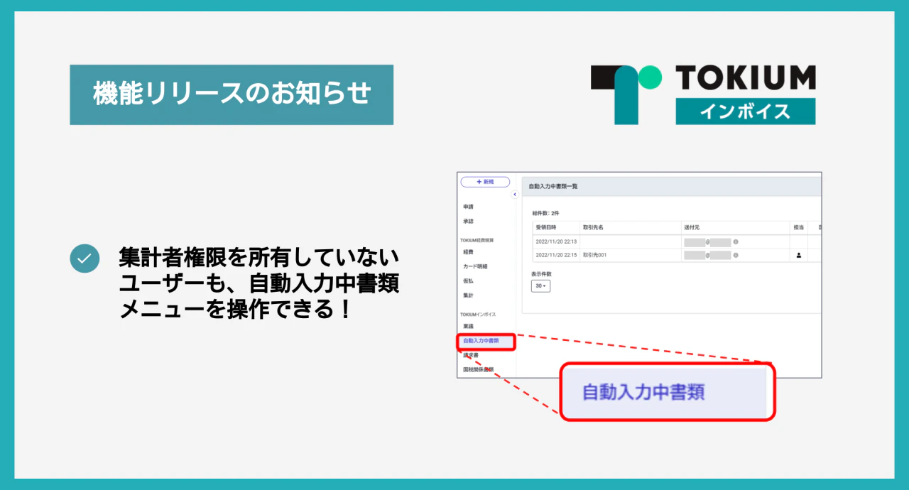 集計者権限を持つユーザーにだけ、「自動入力中書類」というメニューが表示されていました。