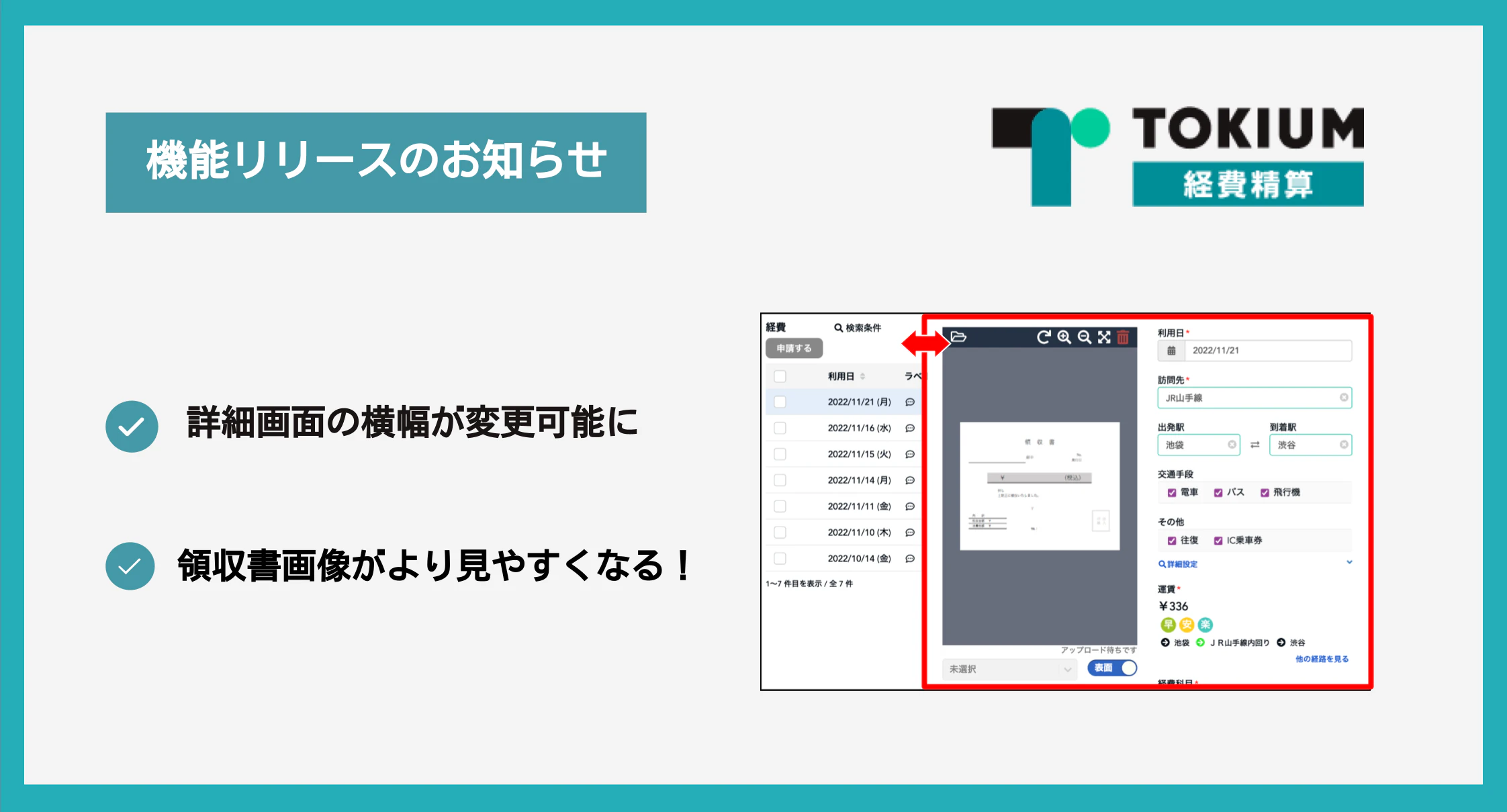 経費一覧にて、経費詳細画面の横幅を自由に変更できるようになりました。