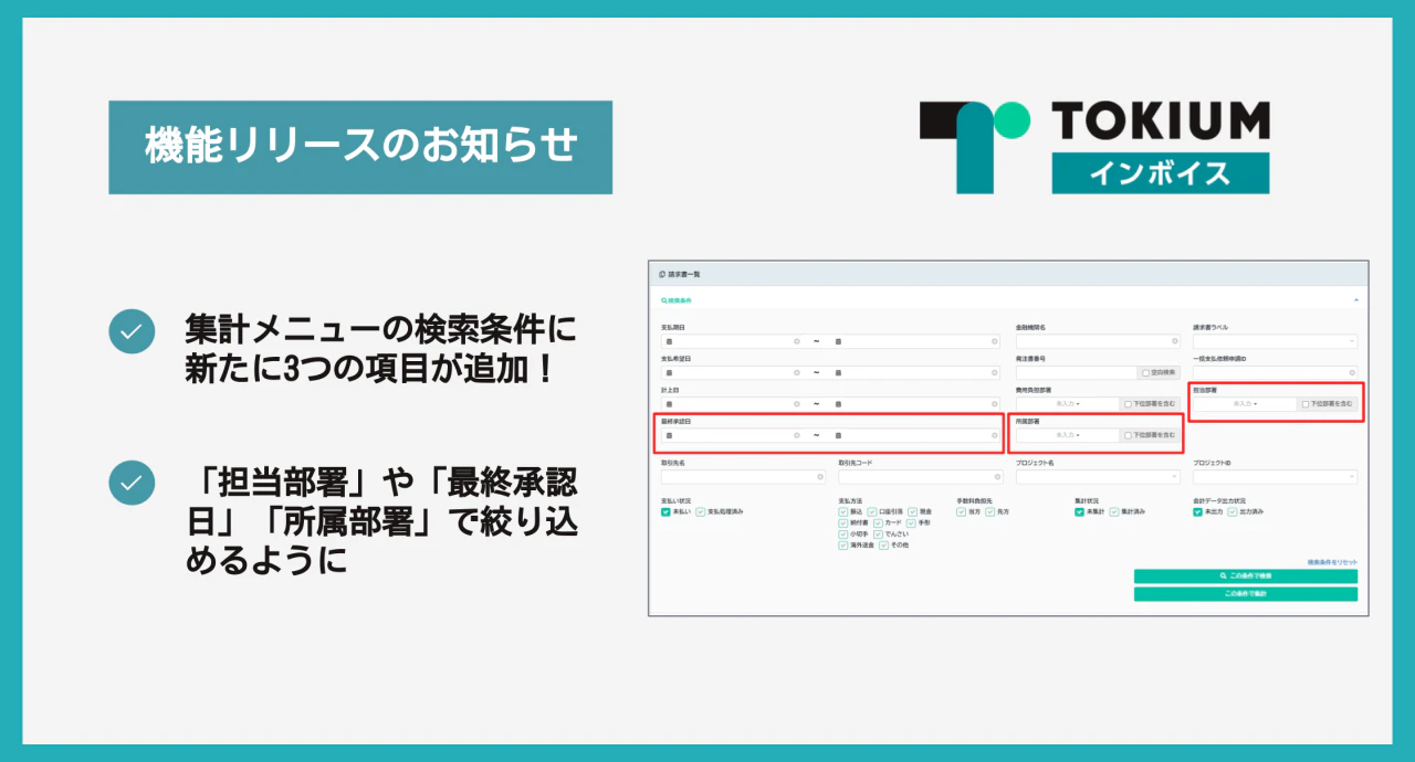 集計画面の検索条件に、新たに「担当部署」と「最終承認日」、「所属部署」が追加されます。