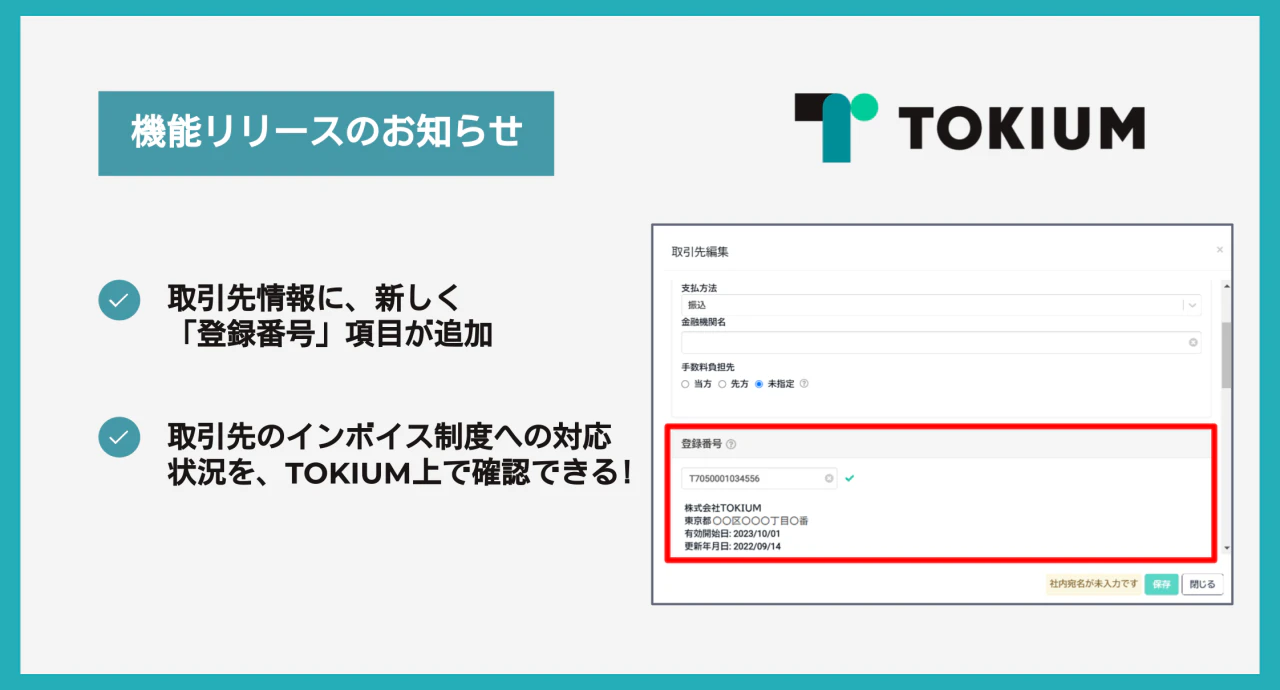 本アップデートにより、取引先の適格請求書発行事業者への登録状況を、TOKIUM上で確認できるようになります。