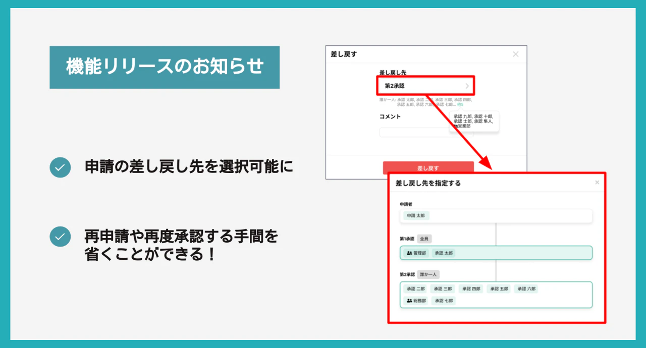 本アップデートにより申請者の再申請や、差し戻し先より前の承認ステップの承認者による再承認の手間を省くことが可能です。