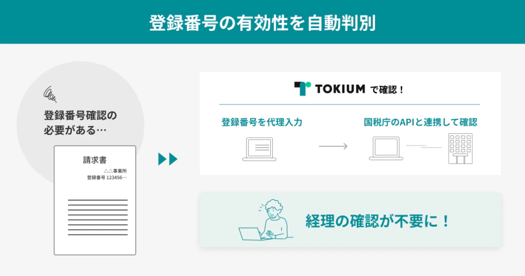 TOKIUMは、取引先の適格事業者登録番号(以下、登録番号)を取引先情報に登録する機能や、受領した請求書や領収書の登録番号が有効かどうか自動で照合できる機能をリリース予定です。