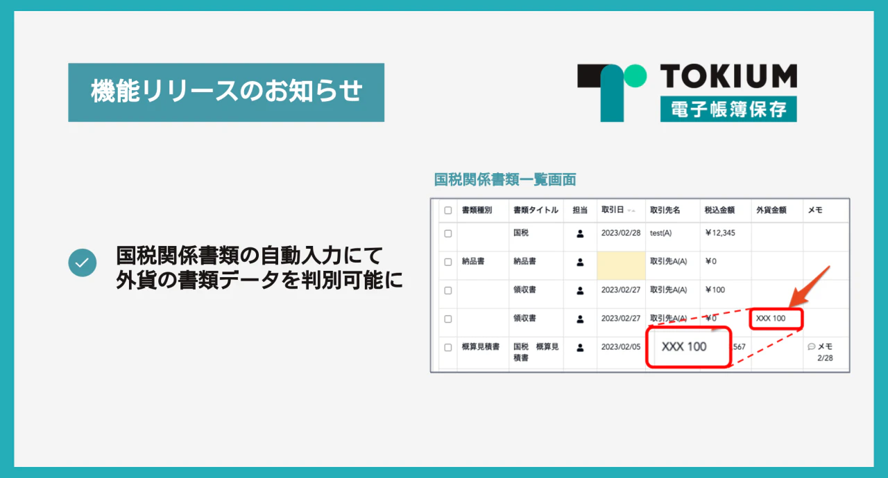 外貨が利用された国税関係書類に関しては、外貨金額欄に「XXX(外貨不明)」としてデータ化されるようになります。