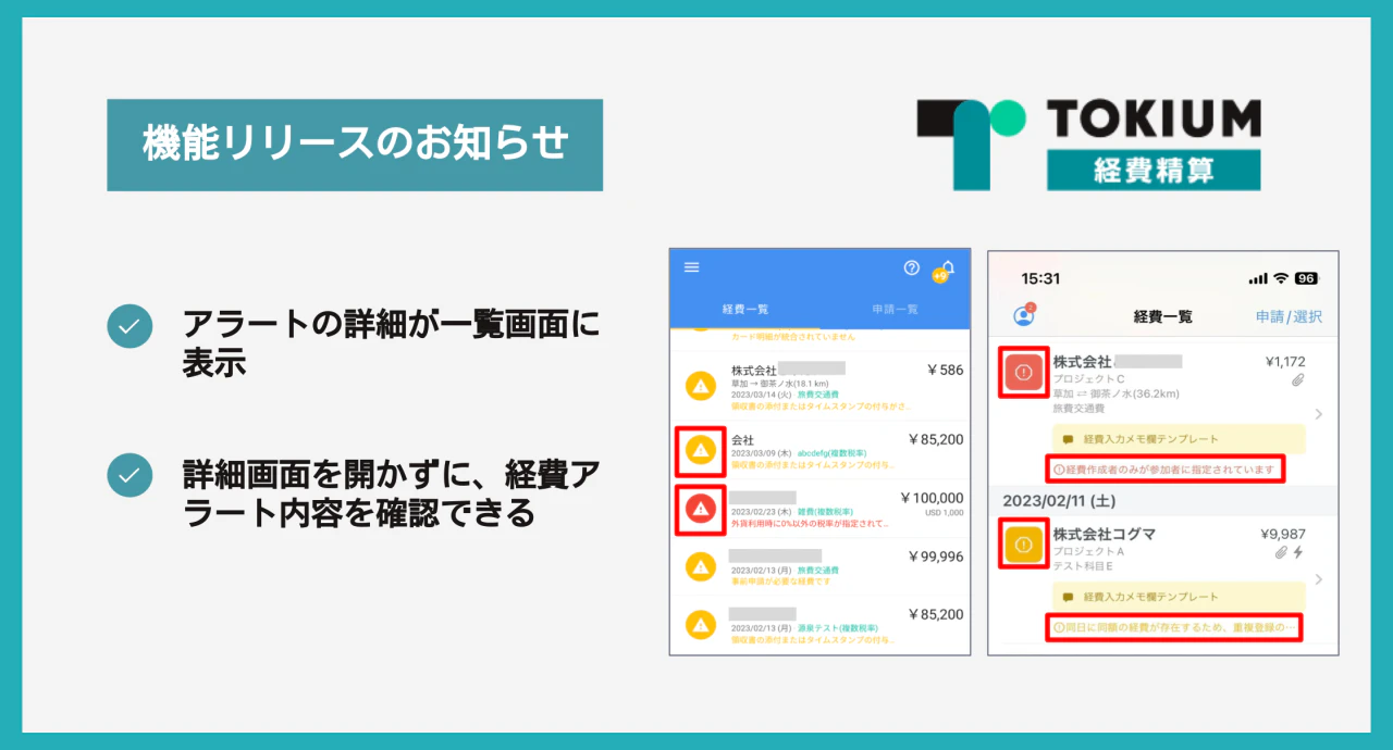 具体的なアラート内容を確認するためには、経費詳細の画面を開く必要がありました。