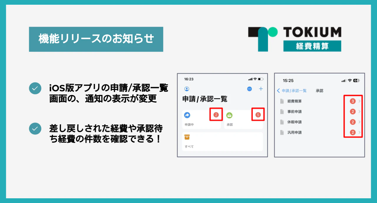 iOSアプリの「申請/承認一覧」画面に、差し戻しや取り下げ、承認待ちの申請の件数が表示されるようになりました。また「申請中」メニューでは、「承認待ち」「取下げ」「差し戻し」の申請ステータスも確認が可能です。