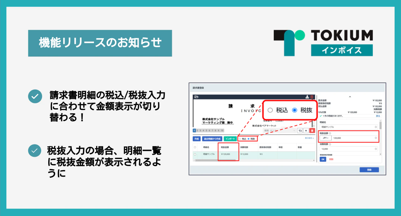 明細の税込/税抜設定に応じて、明細一覧の金額が以下の表示に切り替わるようになります。