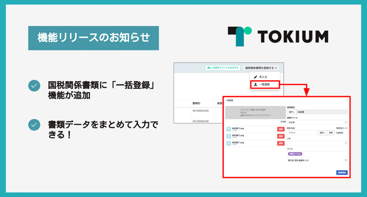 国税関係書類を手動登録する際は、1件ずつ登録する必要がありました。