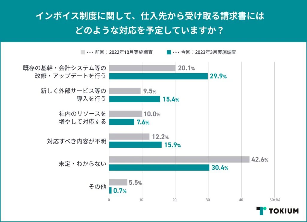 今回の調査により、インボイス制度への対応を初めている企業もありますが、受領側の対応方針が定まっていない企業は約半数近く存在することがわかりました。一方で、インボイス制度に関する情報が広まり、自社のリソースで対応するよりも、システム導入などより効率的な対応を行う企業が増加している傾向がみられます。