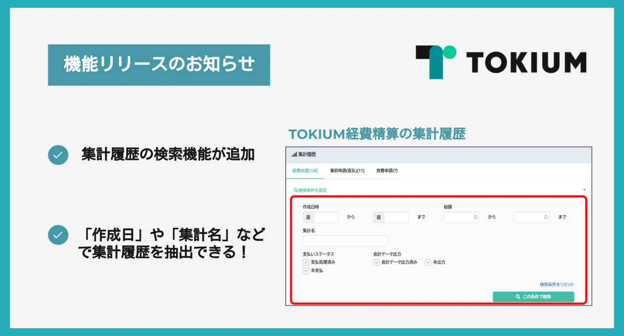 集計履歴に検索機能が追加され、「作成日」や「集計名」などの条件を指定して、集計履歴を抽出できるようになります。