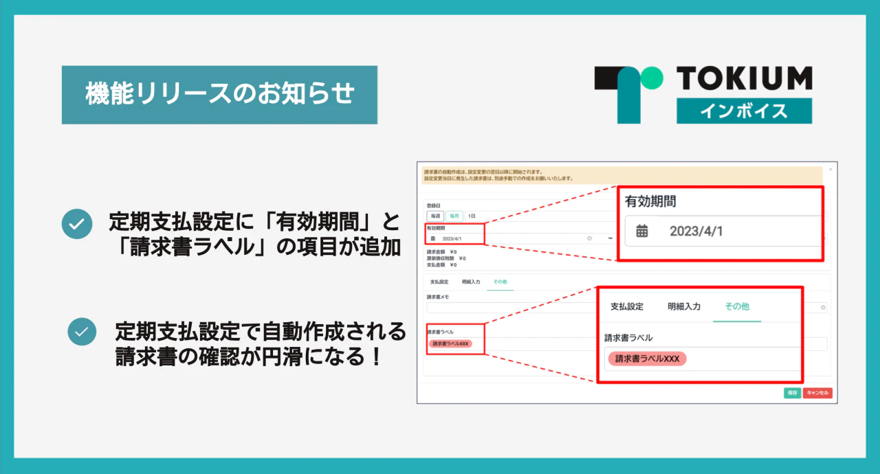 ・有効期限:請求書データを自動作成する期間を指定できるようになりました。
